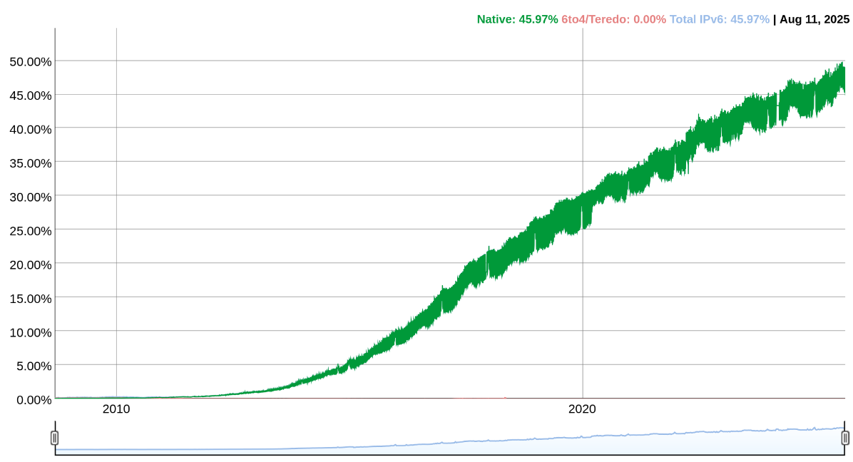 IPv4 begynner å bli dyrt og vanskelig, og det er nok en av hovedgrunnene til at IPv6-grafene til Google nærmer seg 50%: